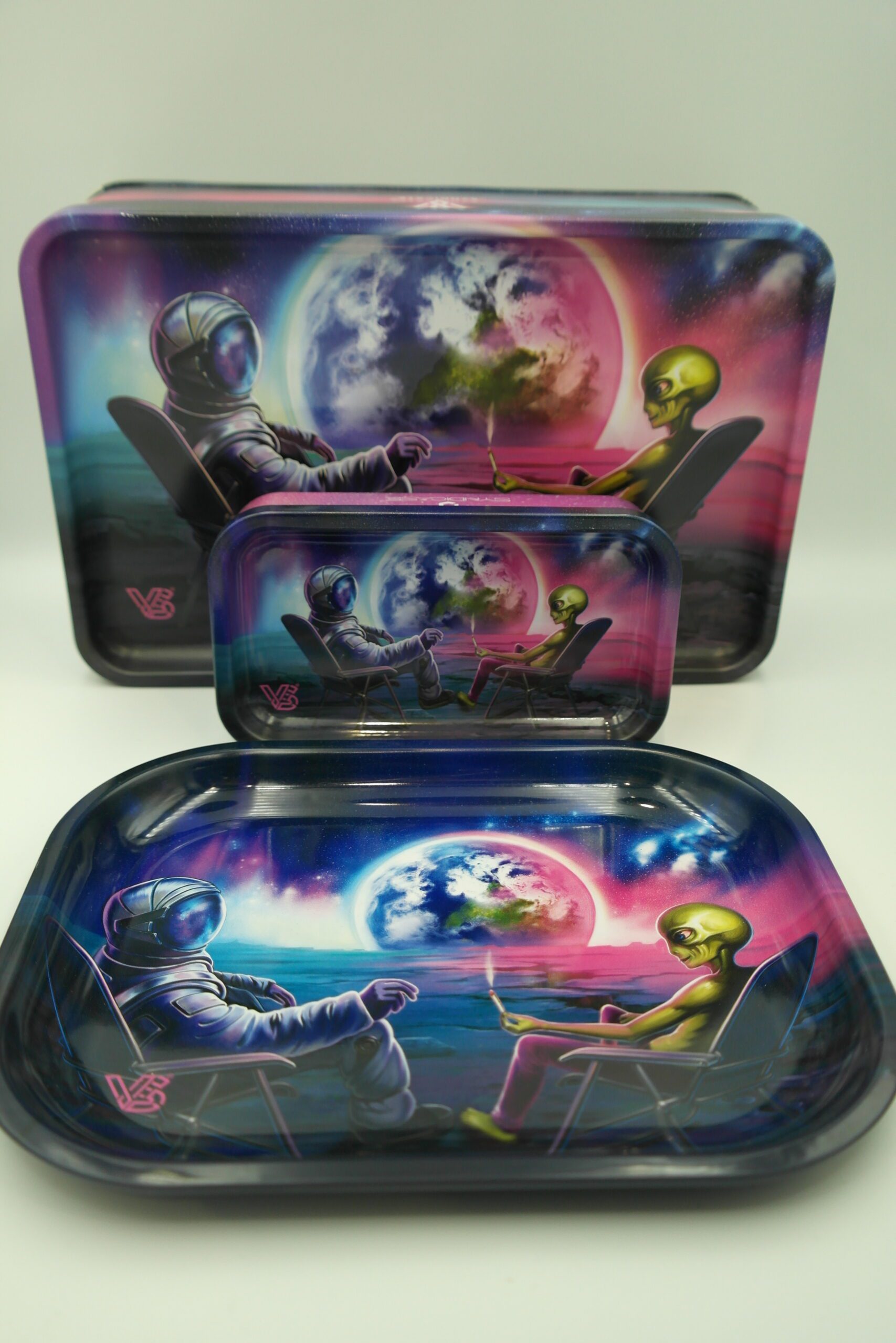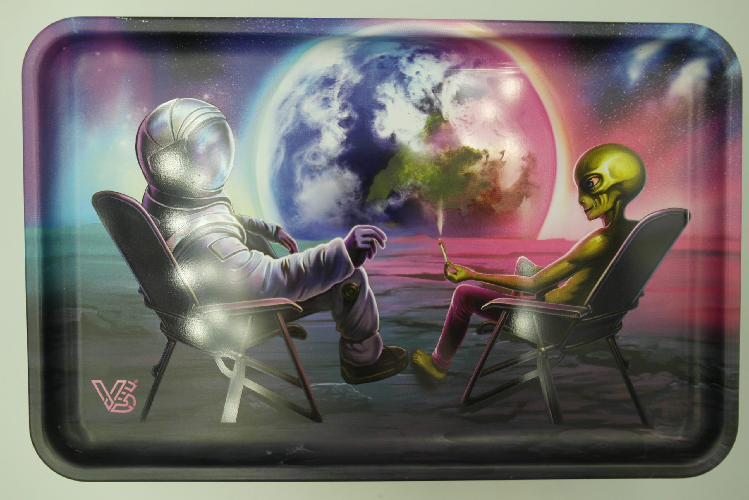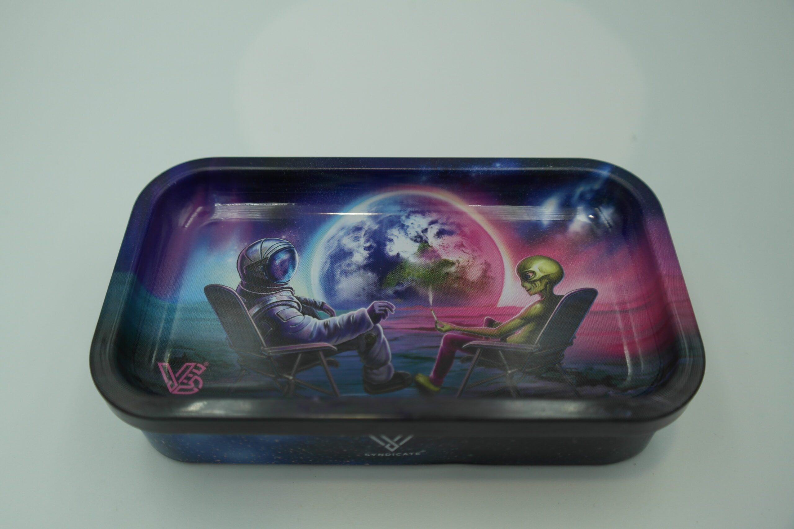 👨🚀 La boîte en métal Syndicase+ Blunt Orbit attire immédiatement le regard avec son illustration originale inspirée de l’espace. On y découvre un astronaute et un alien profitant d’un moment de détente face à l’immensité du cosmos 🌌. Sur son fond noir profond, ce visuel captivant transforme cette boîte en accessoire à la fois pratique et décoratif.