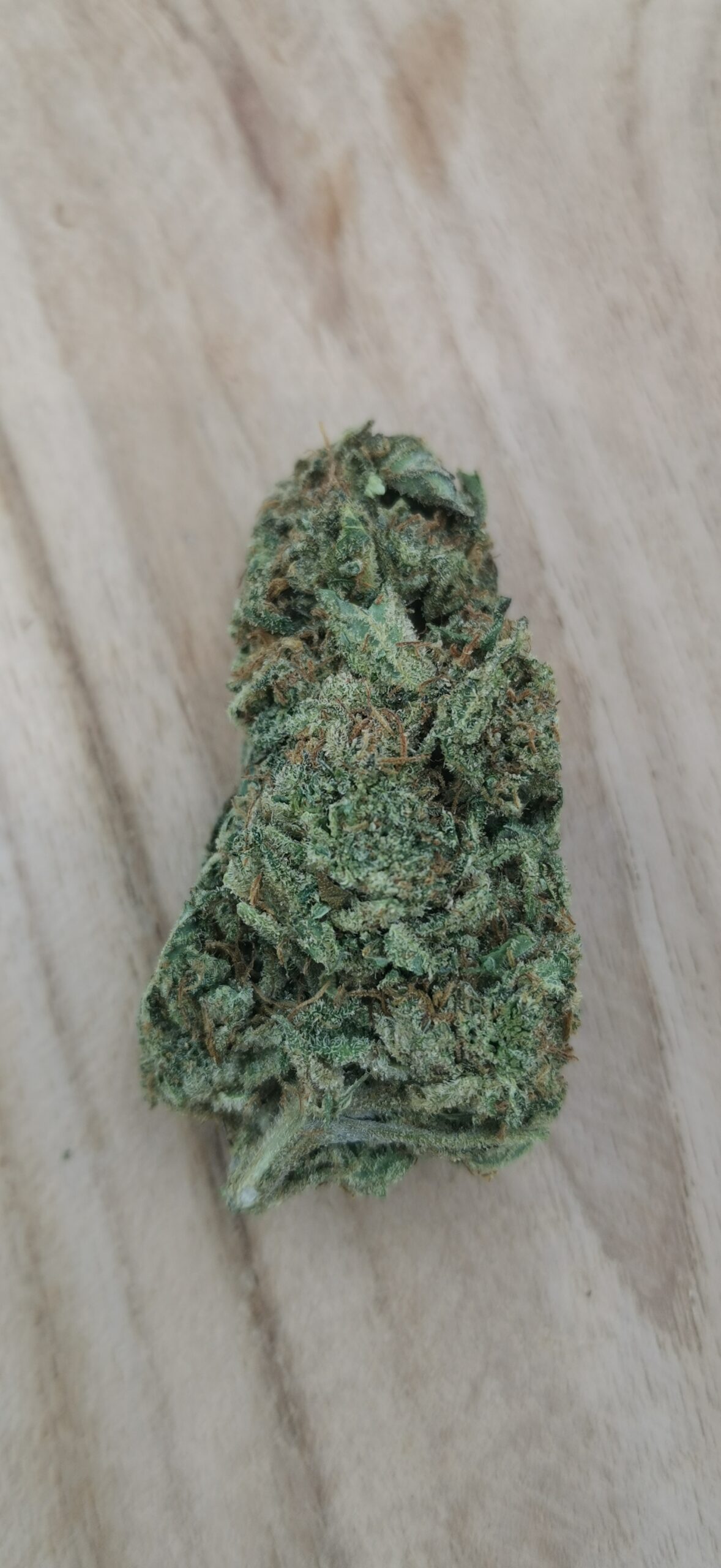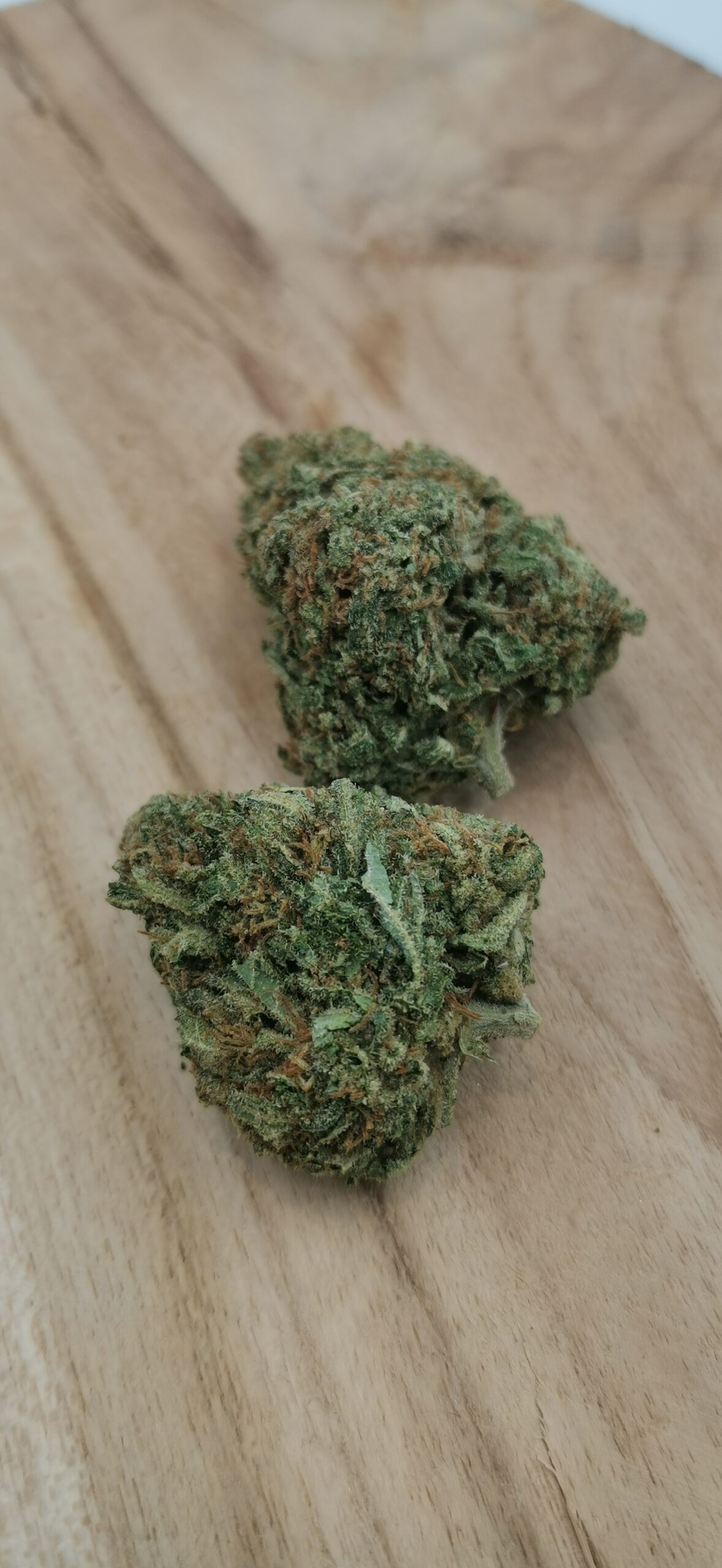 Ses têtes sont compactes et résineuses, d’un vert clair lumineux, constellées de pistils pâles et d’une fine couche de trichomes scintillants ✨🌿