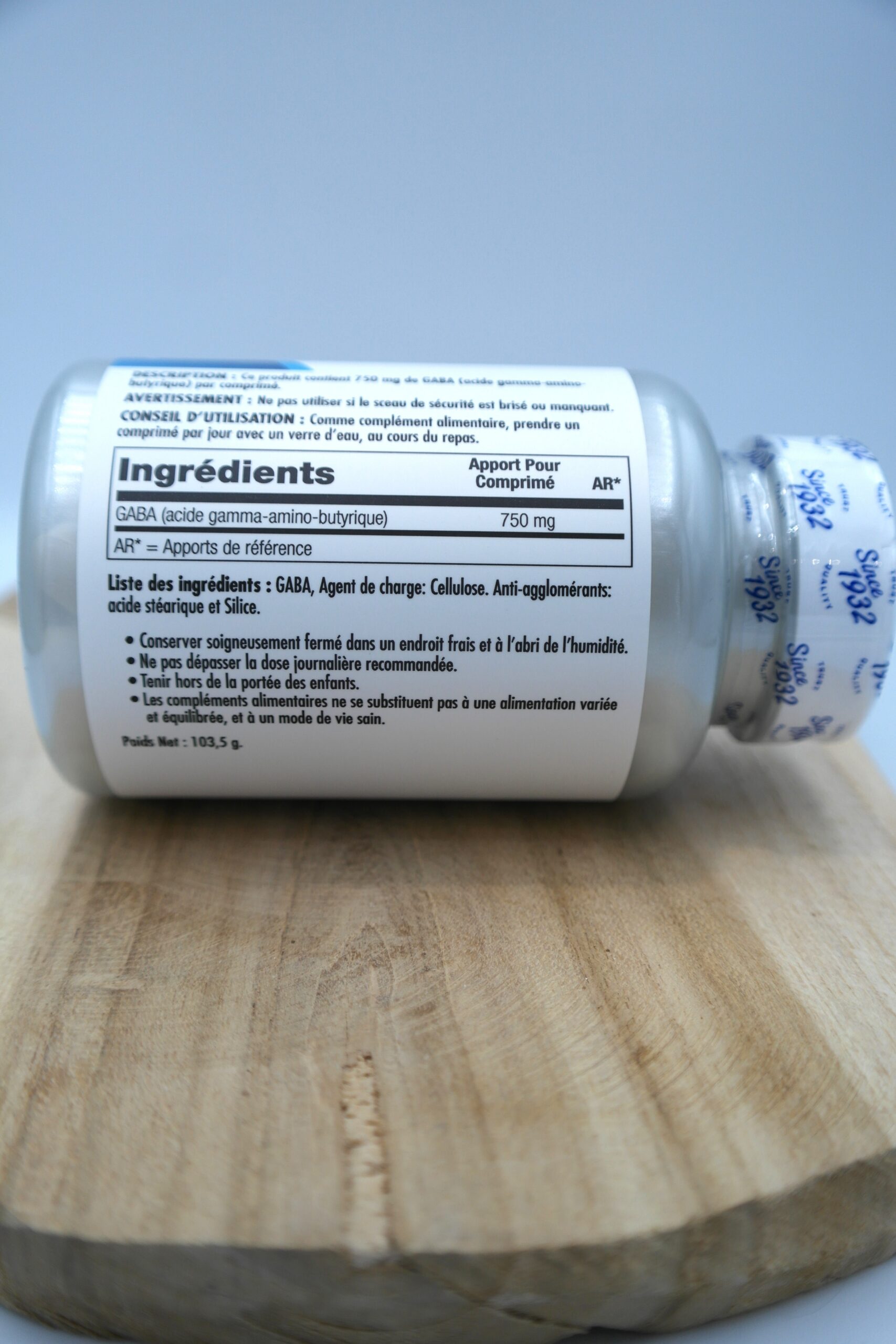 🧠 GABA (acide gamma-aminobutyrique) – environ 750 mg /comprimé selon le format.