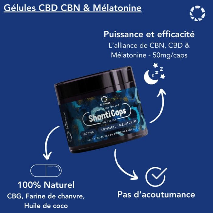 Découvrez nos gélules CBD-CBN & Mélatonine Sommeil 1000 mg de la gamme ShantiCaps.