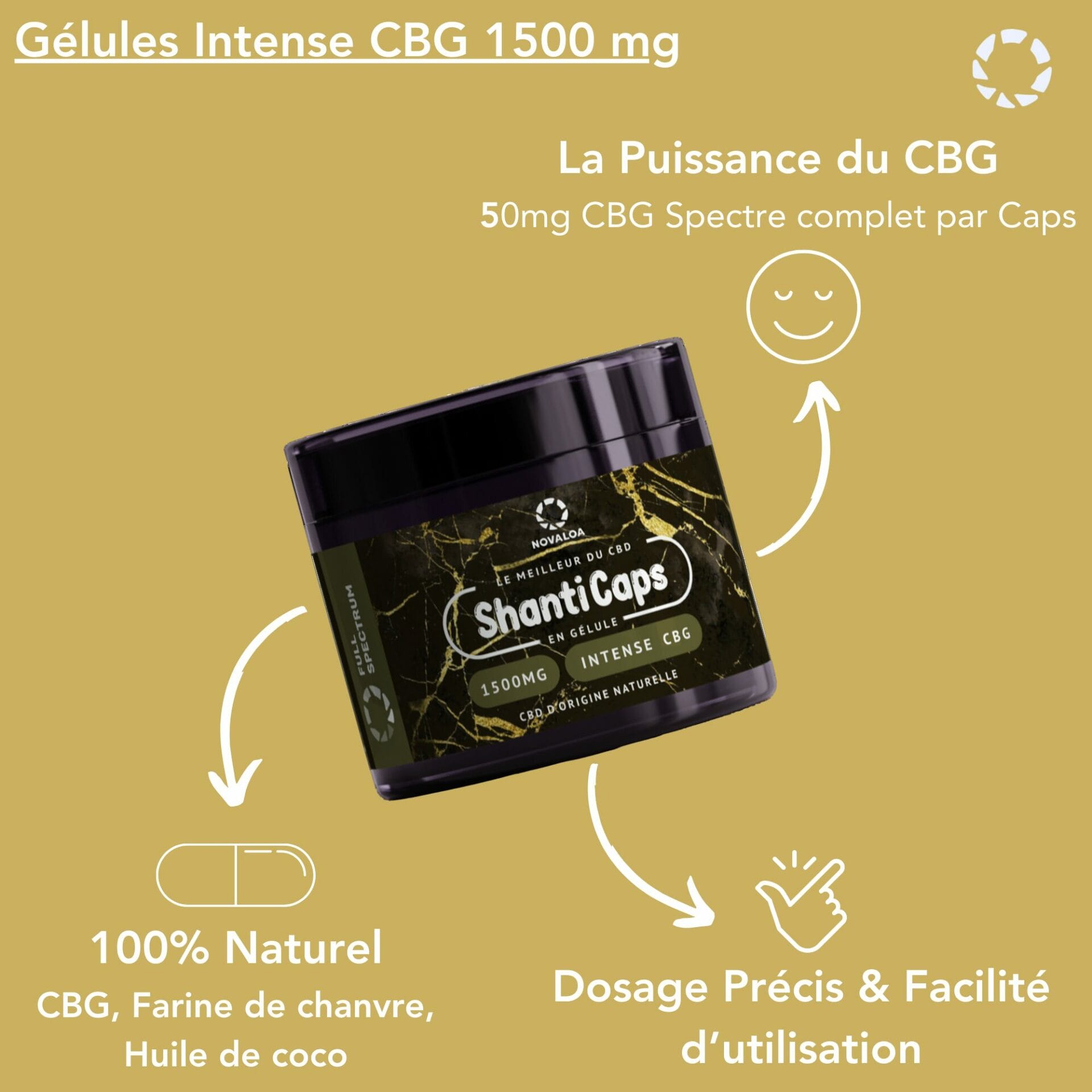 Nos gélules Intense CBG 1500 mg sont élaborées à partir de notre huile Intense CBG spectre complet, avec 1500 mg de cannabinoïdes par boîte de 30 gélules.