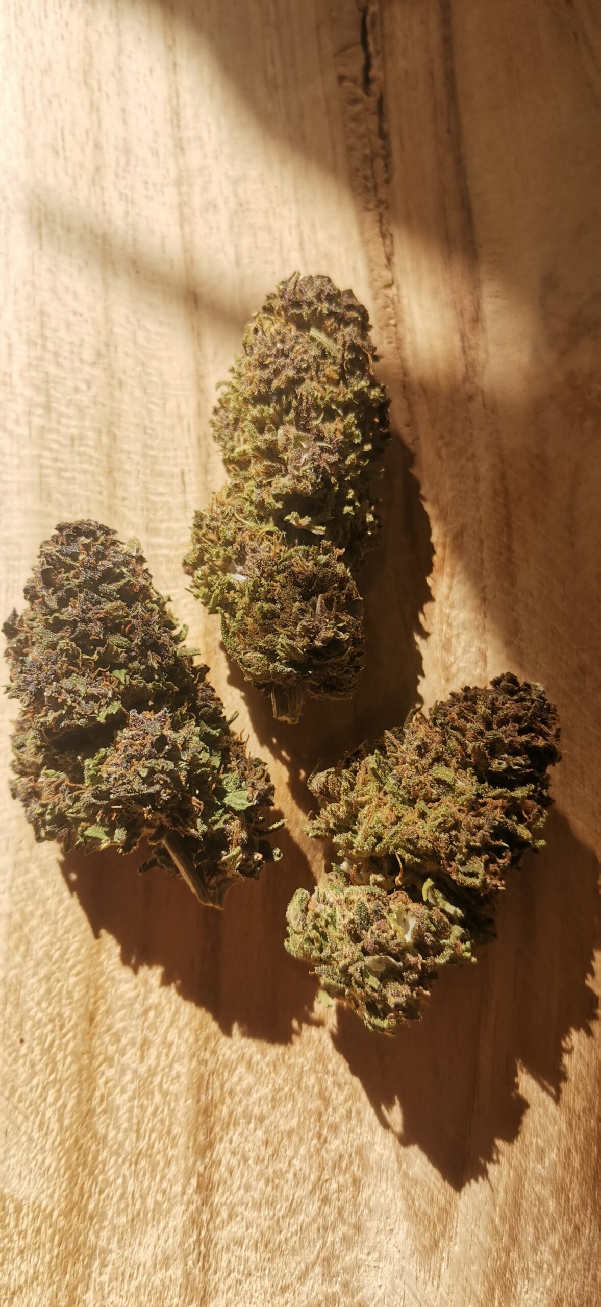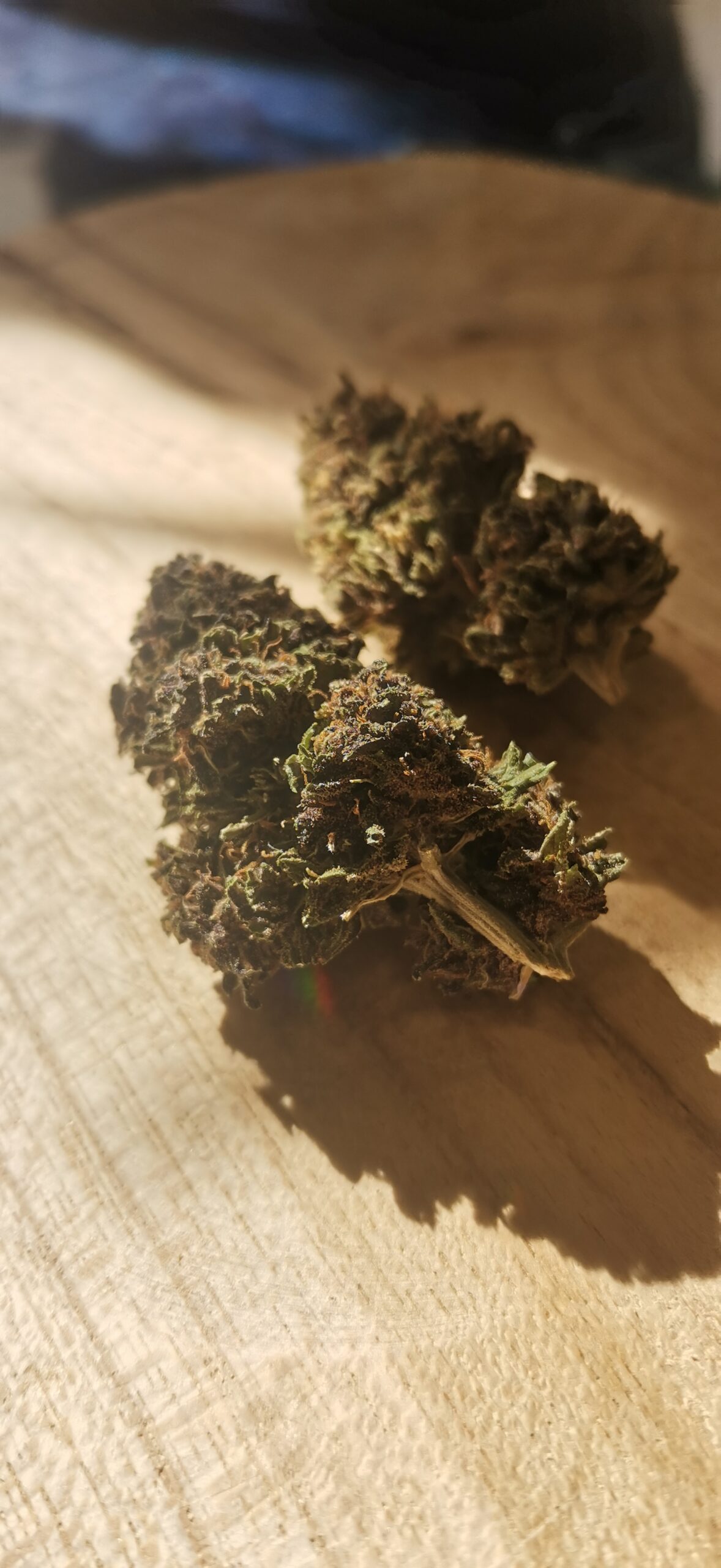 Ses têtes sont compactes et riches en résine, avec un vert clair éclatant sublimé par des pistils orangés et parfois de légers reflets rosés, le tout recouvert d’une fine couche de trichomes scintillants ✨🌿